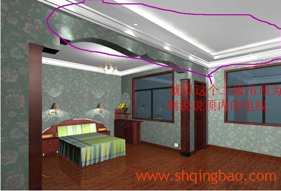 电路施工图解 1,顶上是二级吊顶,就以他为例,说一下顶内的电线做法