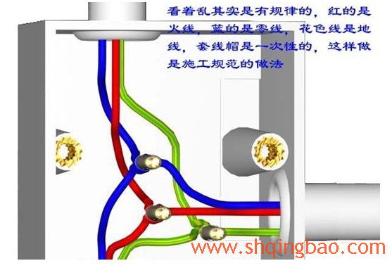 7.电线的打火,短路,接触不良,等等的故障不止是在接头上,还有一处是在接线盒内,有很多的现象是新房子水电都没有问题,装修结束后问题就现来了,再说一下电线盒内线头接法。看着乱其实是有规律的,红的是火线,篮的是零线,花的是地线,套线帽是一次性,有的工人打开后把线接好用胶布简单的处理一下就完事了,这是不正确的。